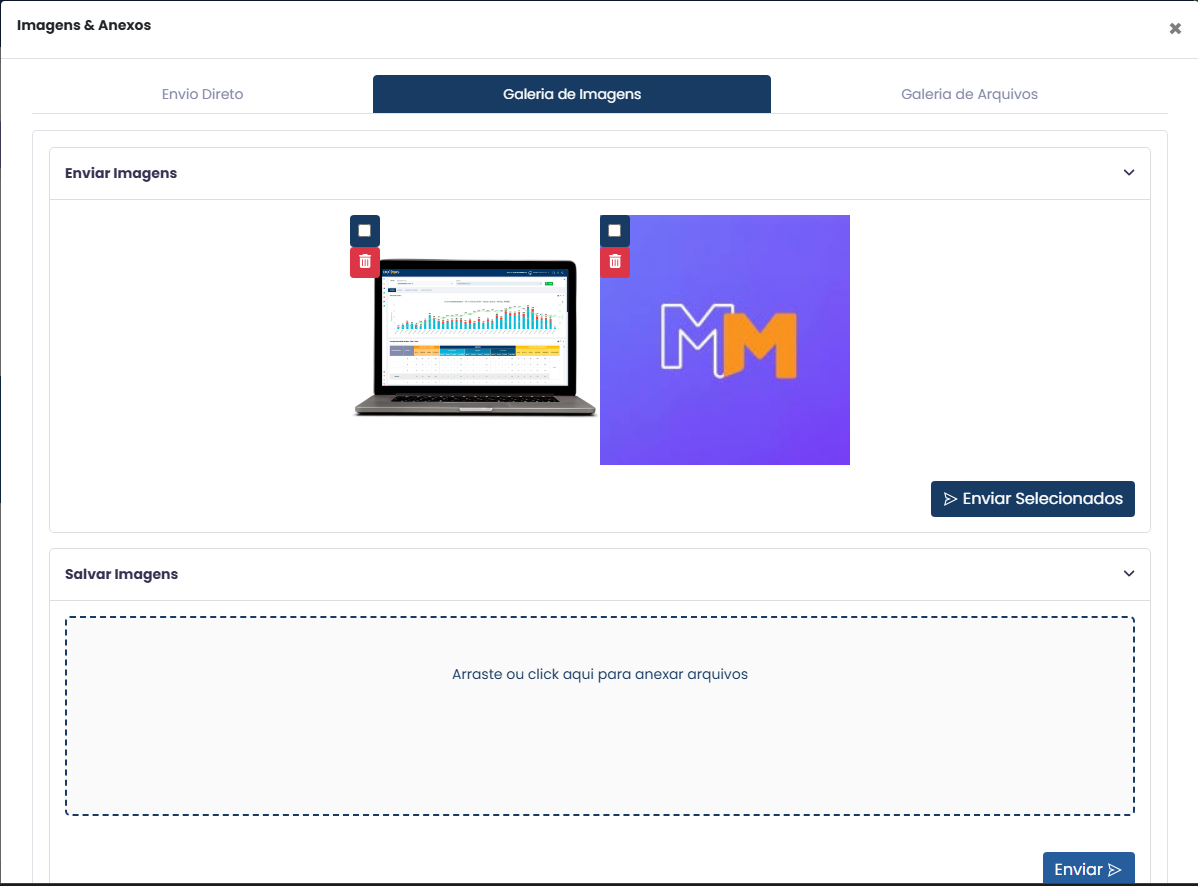 O Conecta oferece uma galeria de imagens para armazenar conteúdos visuais utilizados com frequência — por exemplo, fotos de empreendimentos.