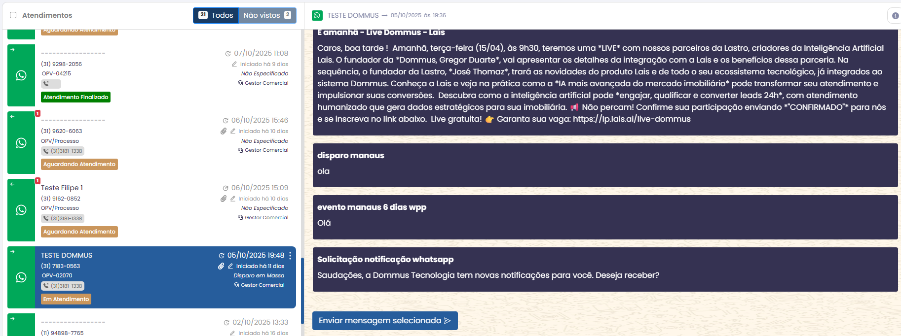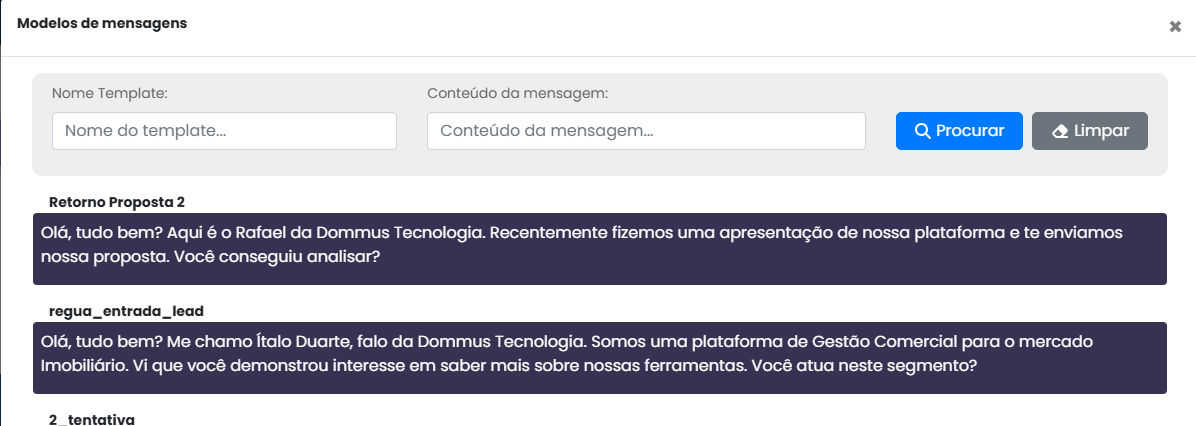 Envio de Templates: é possível reenviar templates aprovados, utilizando o botão “Selecionar Mensagens”, que lista todos os modelos disponíveis para uso.
