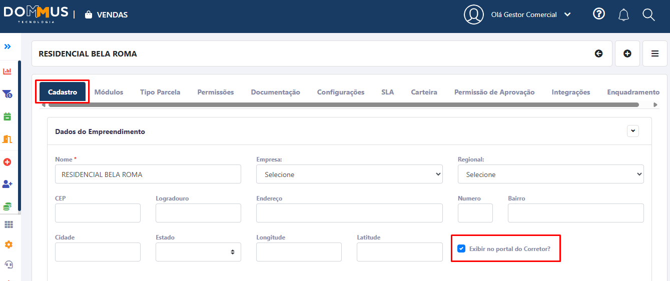 Na aba Cadastro do Empreendimento, localize a opção “Exibir no portal do Corretor?”.