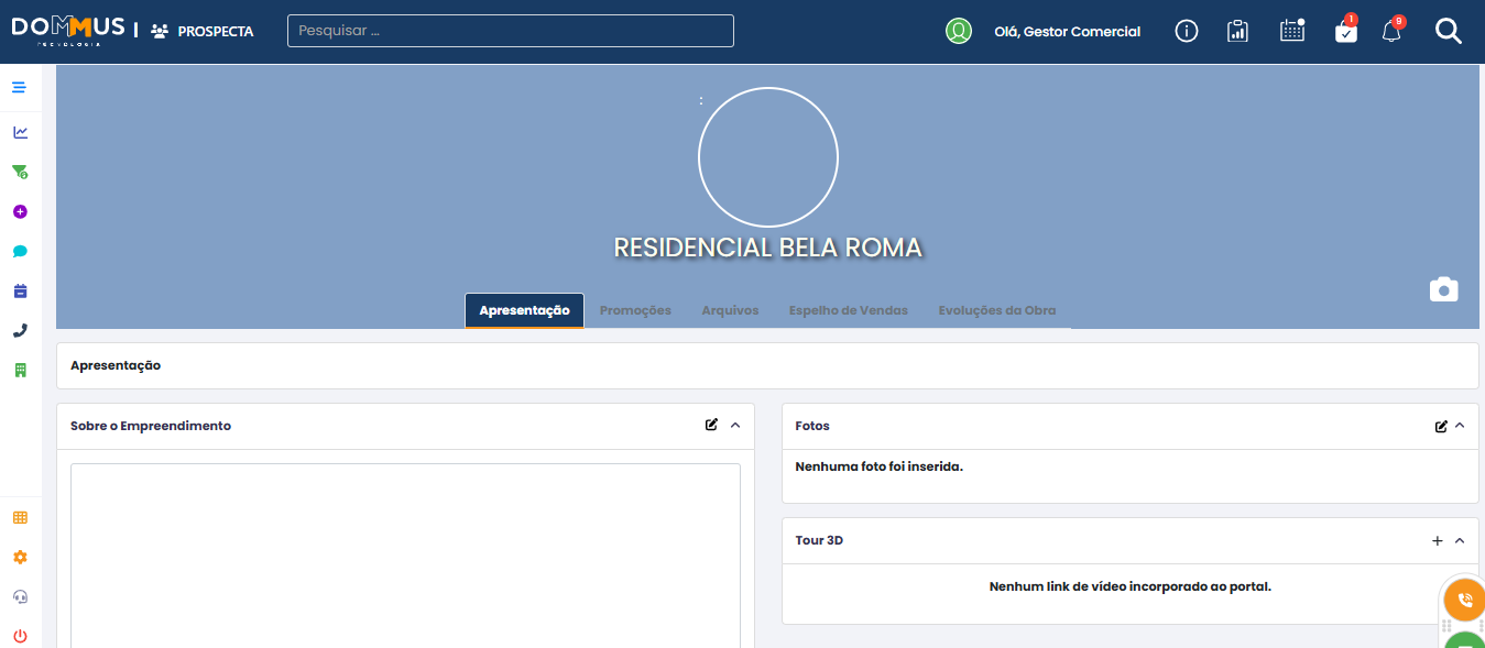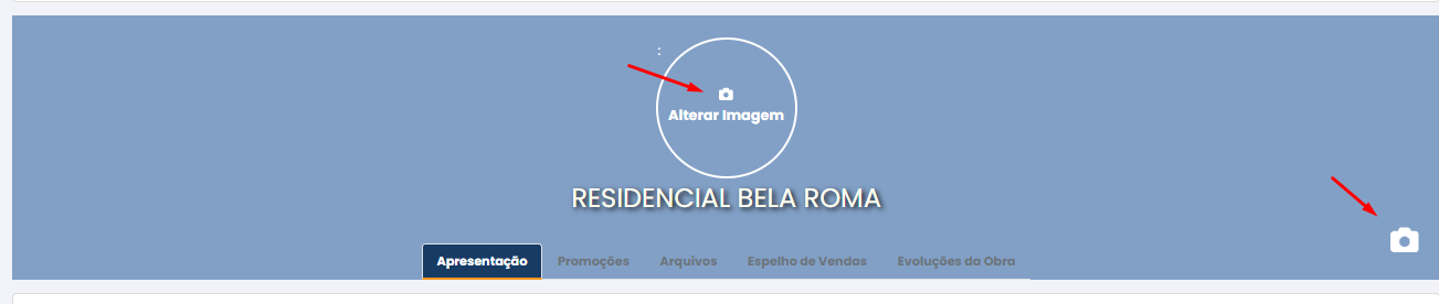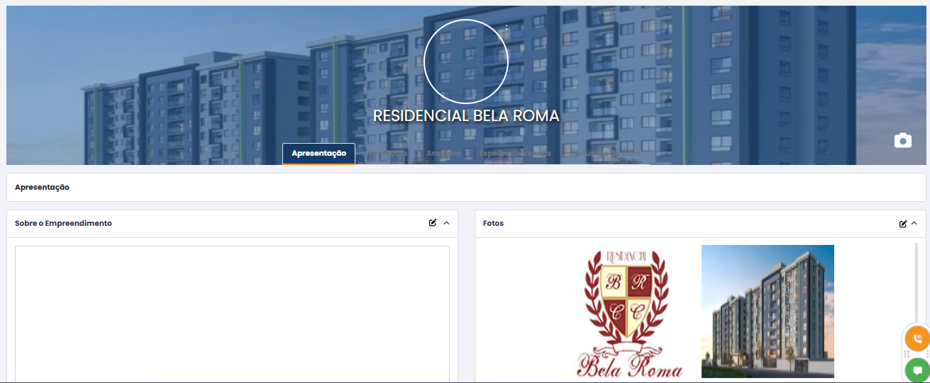 Na primeira aba de apresentação vamos definir as principais informações do empreendimento, começando pela foto dele, para isso podemos inserir uma logo do empreendimento assim como inserir um banner do mesmo dentre outras imagens do empreendimento.