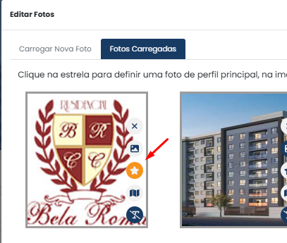 E temos também a configuração para deixar como imagem principal, que vai definir qual imagem irá aparecer nas capas dos empreendimentos na tela inicial e seu ícone é representado por uma estrela.