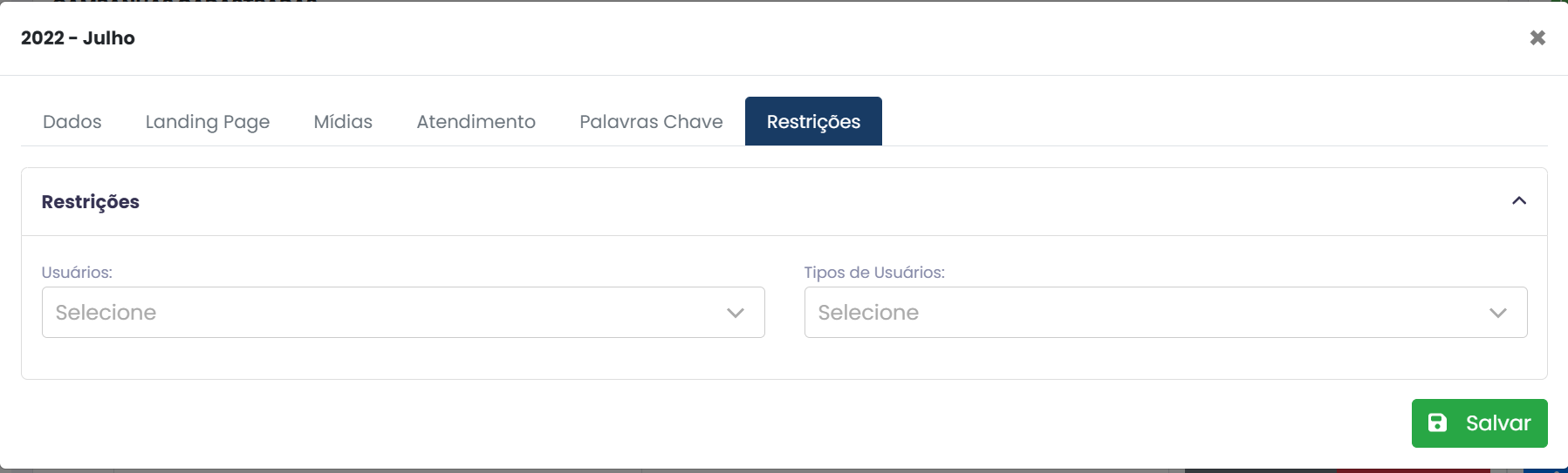 A funcionalidade de Restrições de Visualização de Campanhas permite definir quais usuários ou tipos de usuários poderão visualizar uma campanha dentro do CRM.