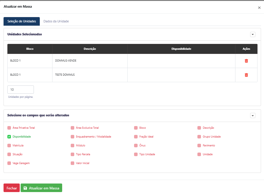 Após selecionar as unidades desejadas, é possível definir quais campos serão afetados pela alteração em massa.