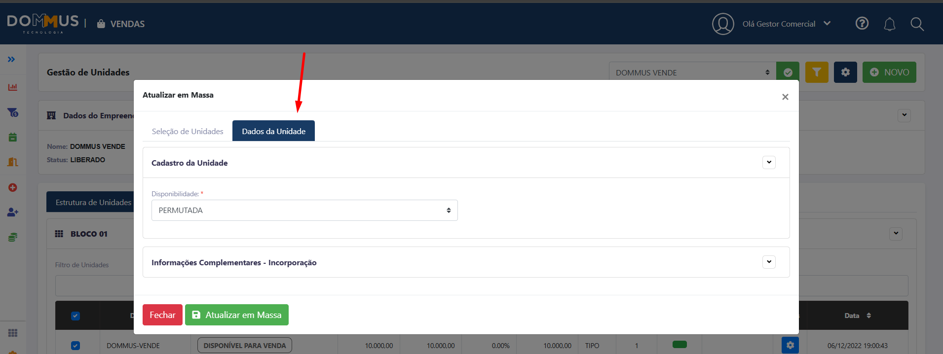 Na sub-aba “Dados da Unidade”, deve-se informar o novo valor para o campo selecionado, que será aplicado às unidades escolhidas.