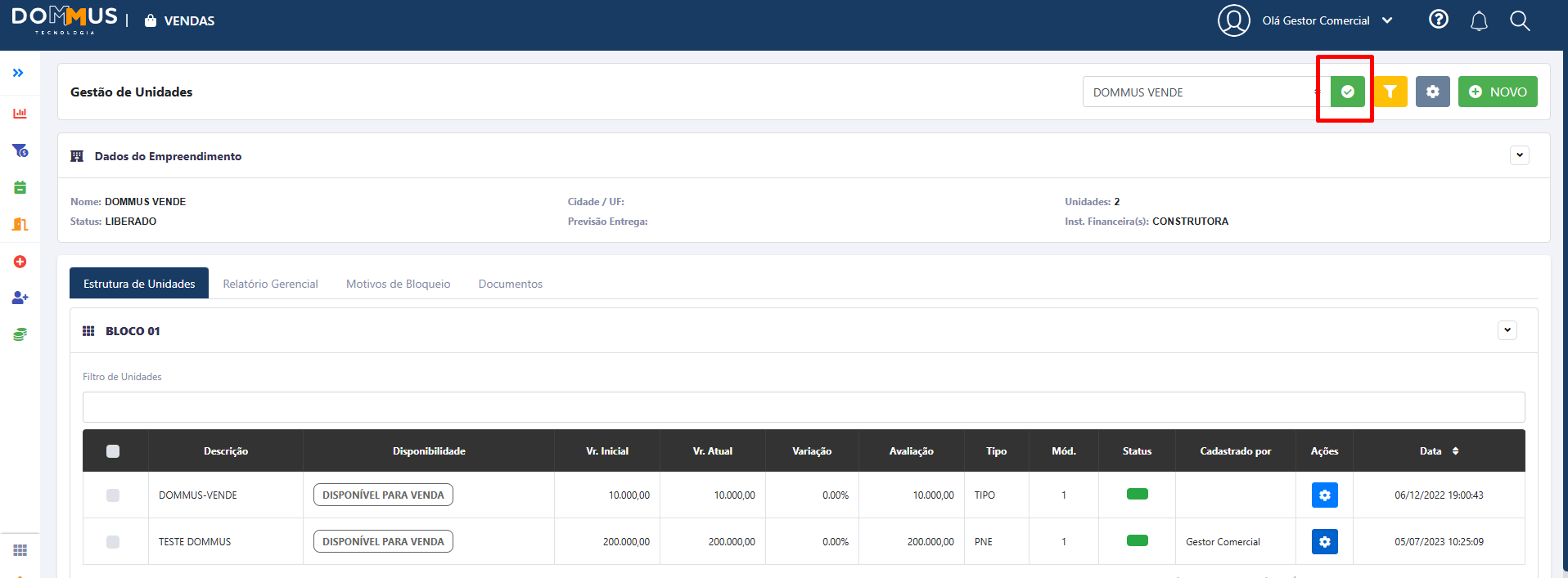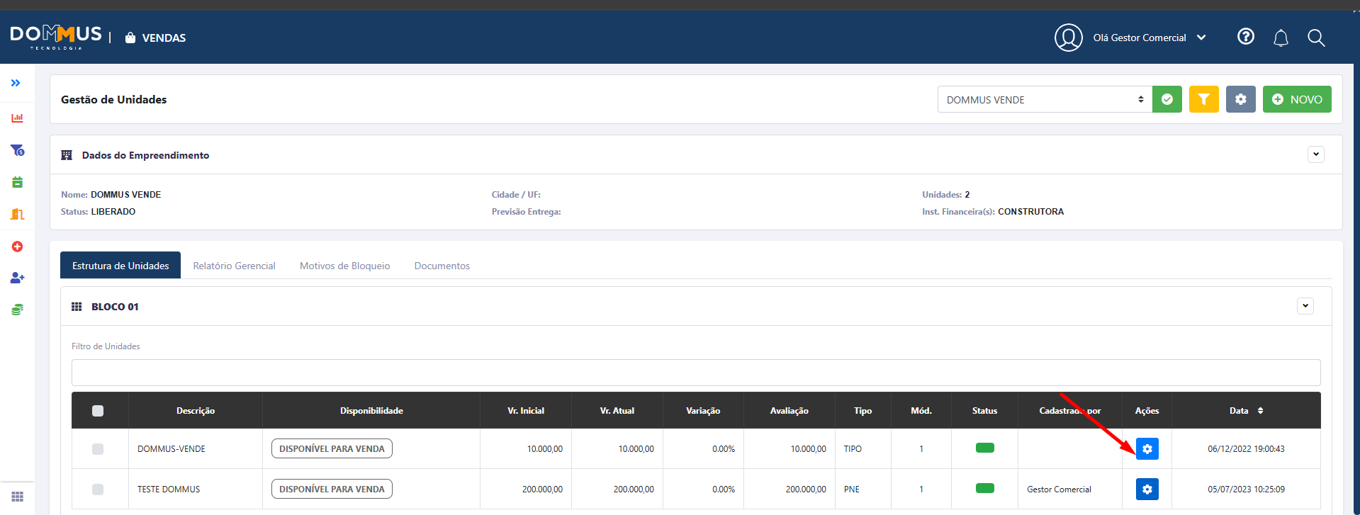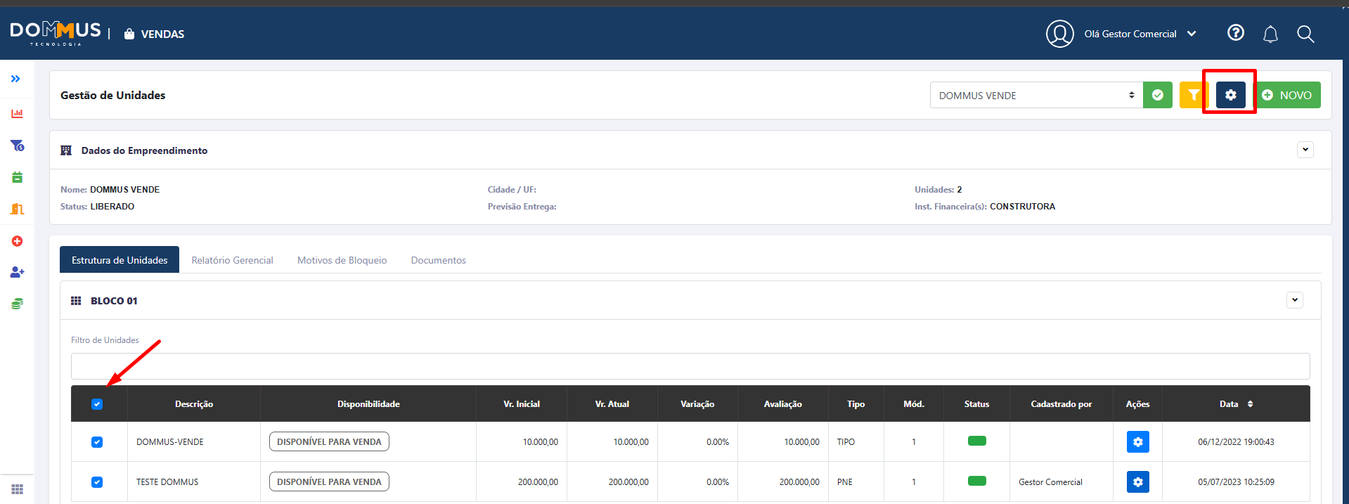 A tela de Gestão de Unidades é onde são realizadas todas as configurações e parametrizações das unidades de um empreendimento.