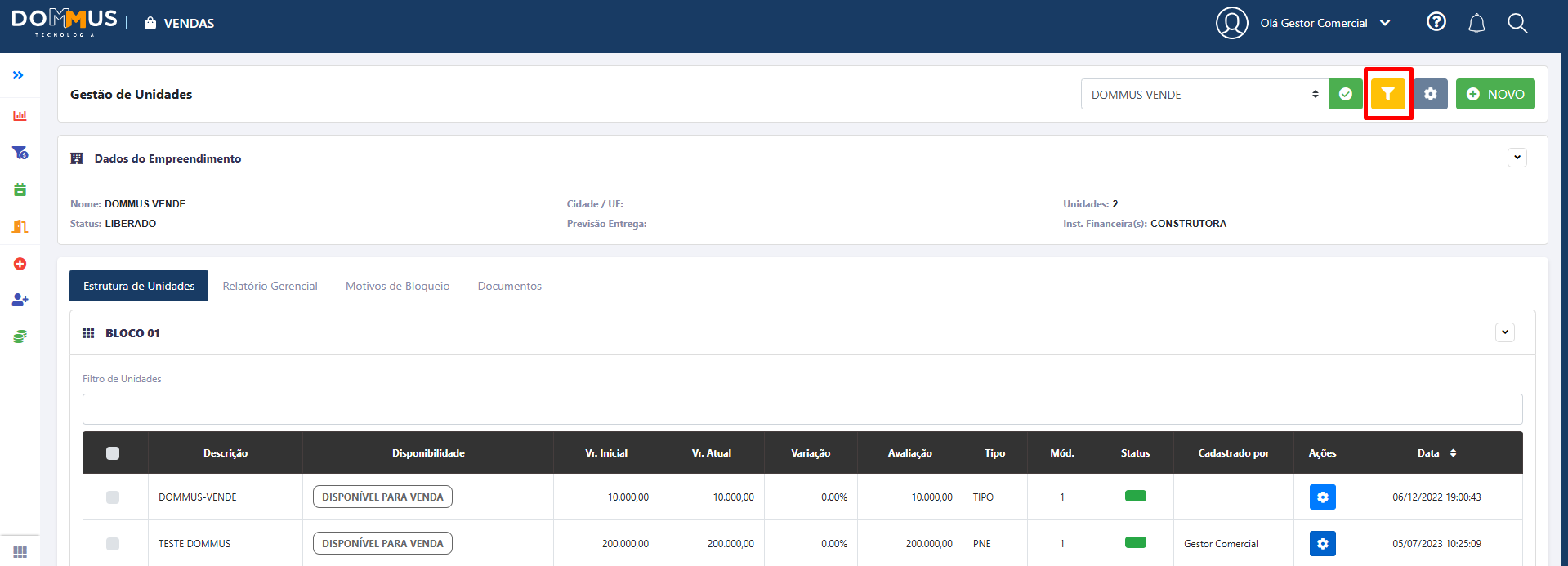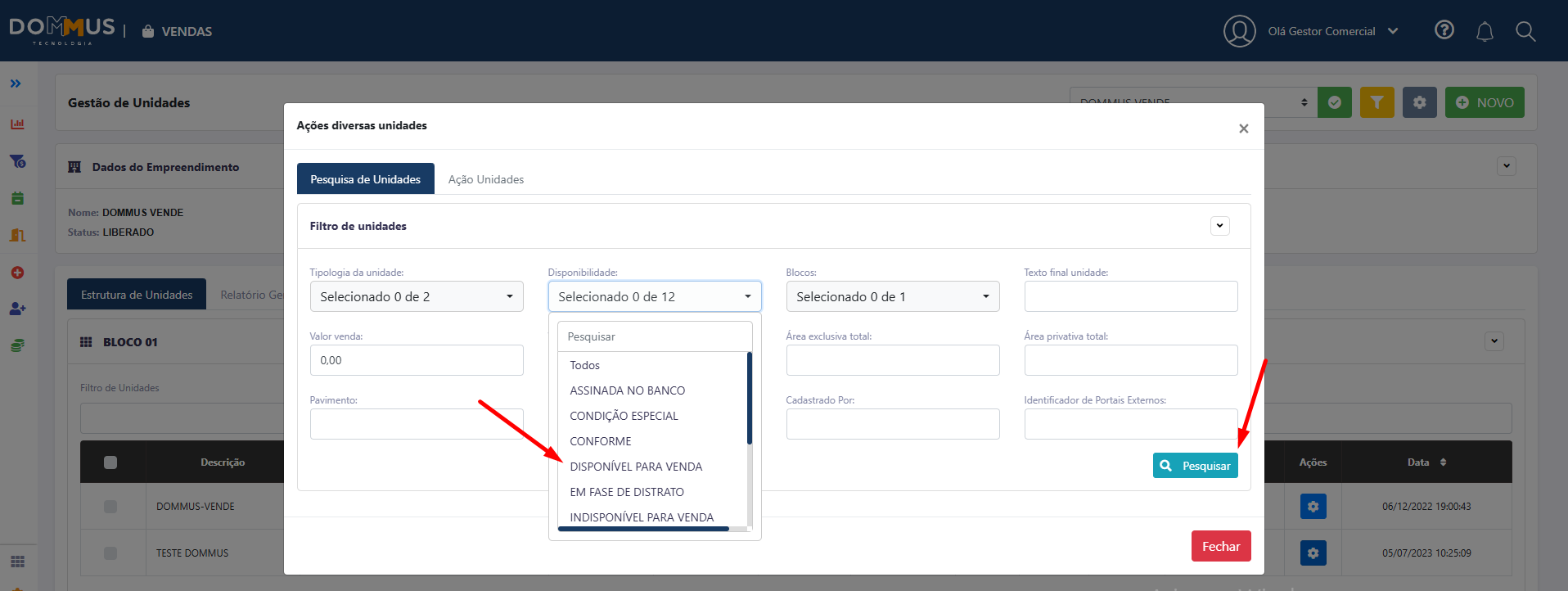 Por exemplo, é possível exibir apenas unidades disponíveis para venda.