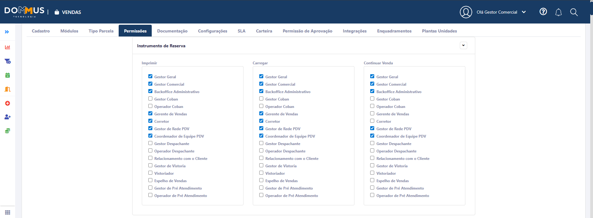 Por exemplo, quando o empreendimento trabalha com Contrato de Reserva, é possível definir quais usuários terão permissão para: