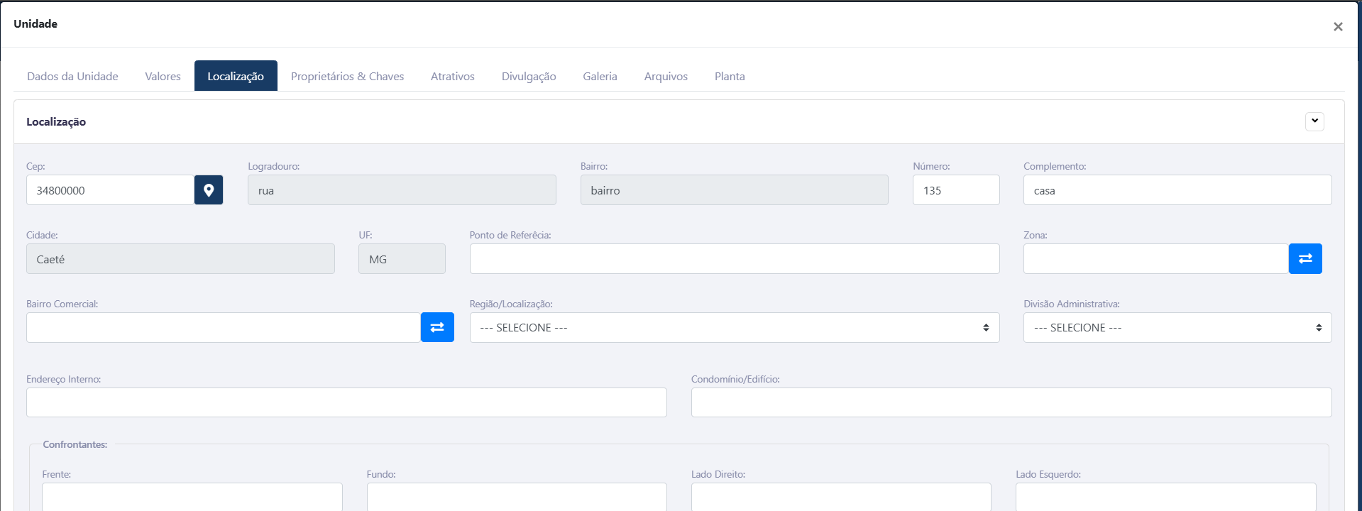 Na sub-aba Localização, é possível definir o endereço do imóvel que está sendo cadastrado.
