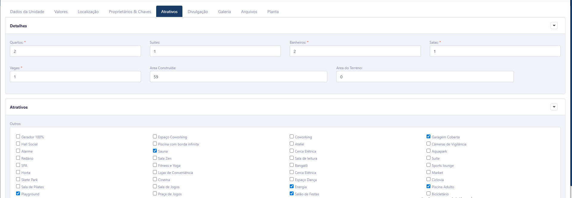 Na aba Atrativos, é possível detalhar as características físicas e os diferenciais da unidade, enriquecendo as informações do imóvel para uso interno e também para divulgação.