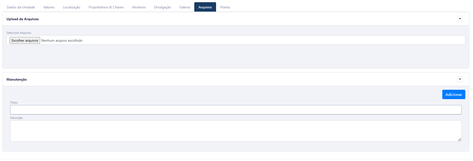 Na aba Arquivos, é possível anexar documentos relacionados à unidade, além de registrar informações de manutenção.