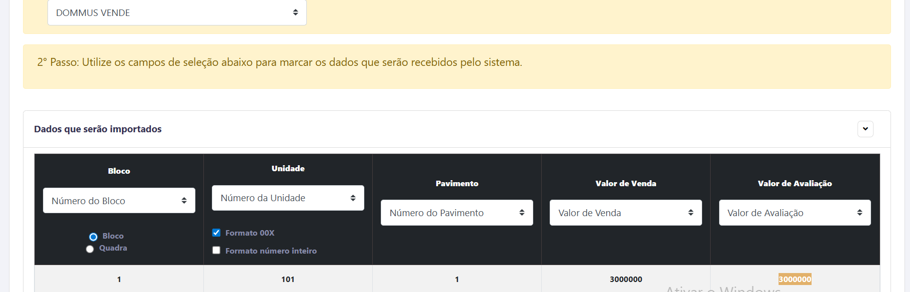 Indique qual coluna da planilha corresponde a cada informação (Bloco, Unidade, Pavimento, Valores, etc.)