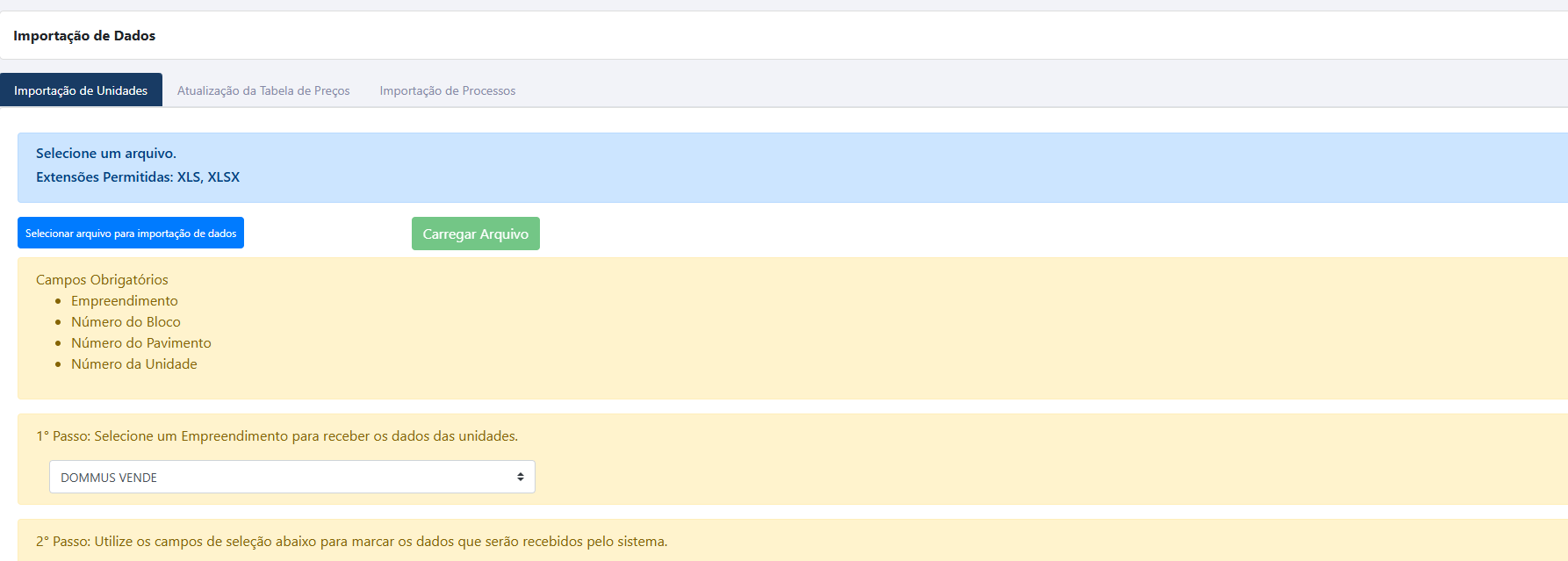 Após anexar a planilha, selecione o empreendimento que irá receber os dados das unidades.