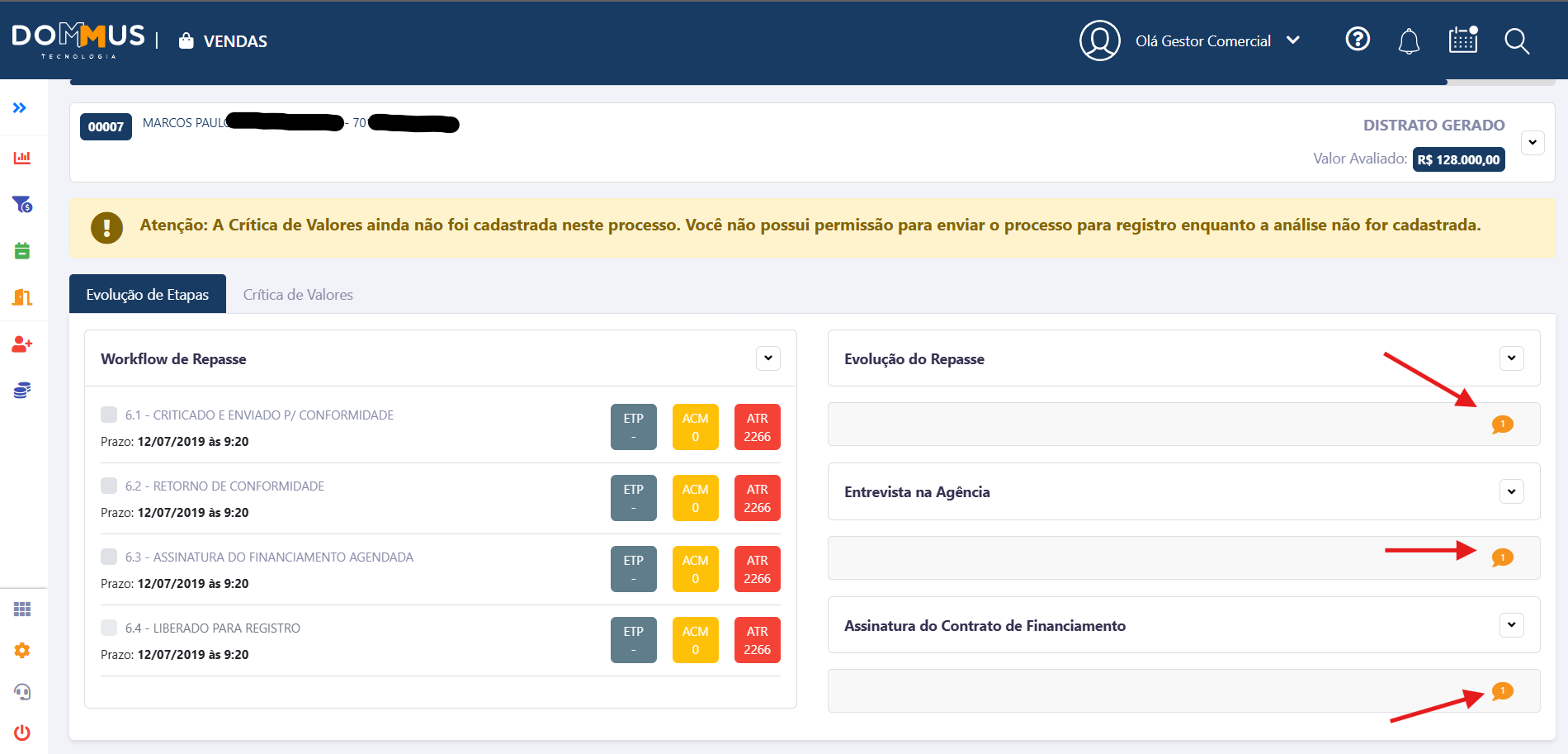 Ao acessar a tela de repasse do processo, temos três seções de comentários, sendo uma para as seções: Evolução do Repasse, Entrevista na Agência e Assinatura do Contrato de Financiamento.