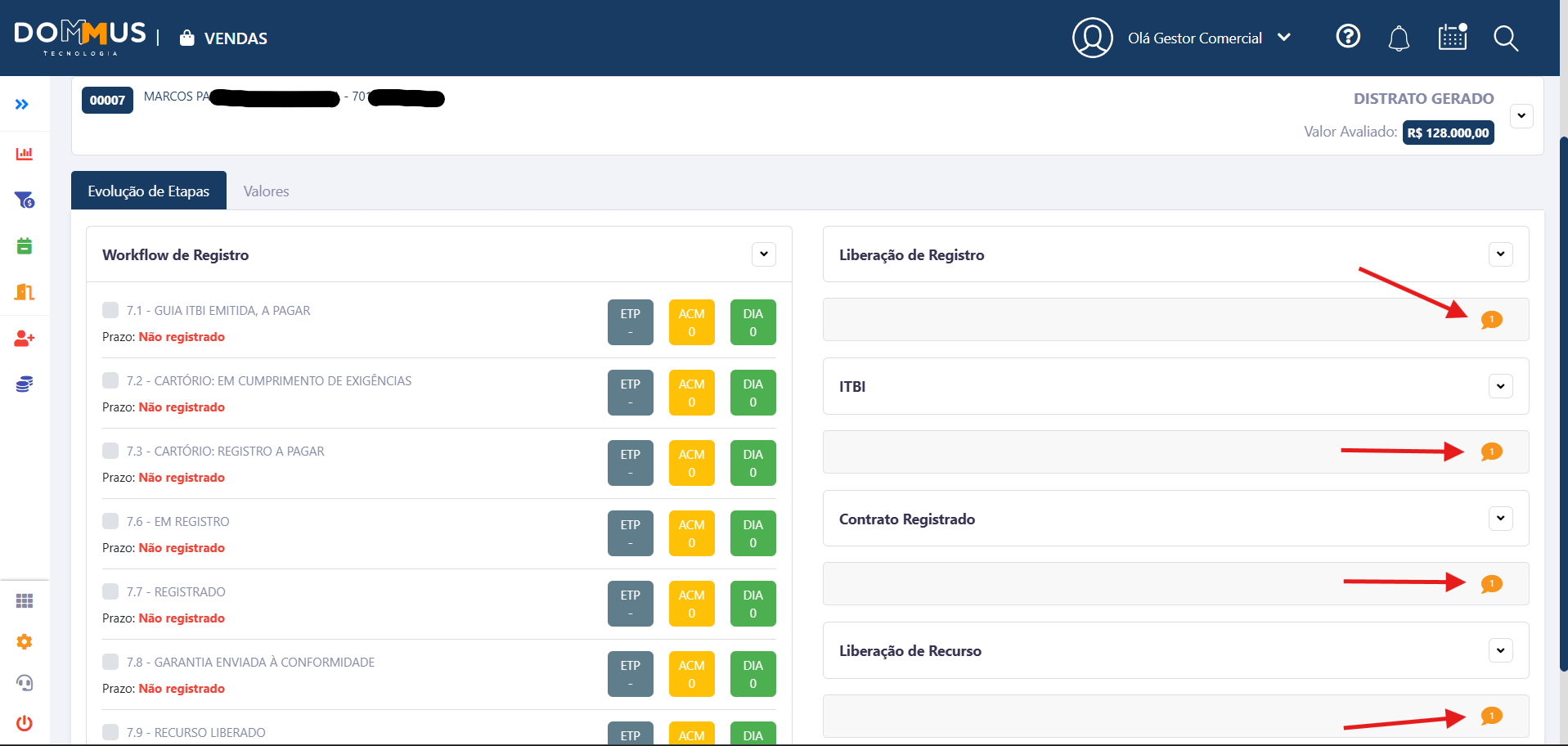 Ao acessar a tela de registro do processo, temos quatro seções de comentários, sendo uma para as seções: Liberação de Registro, ITBI, Contrato Registrado e Liberação de Recurso.