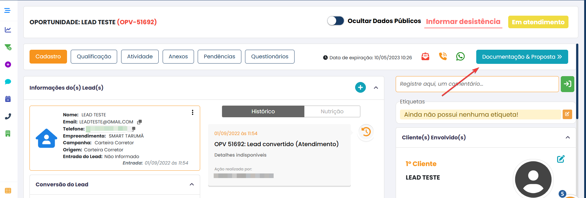 O botão "Documentação e Proposta" será exibido apenas quando a oportunidade estiver em uma etapa de Atendimento.