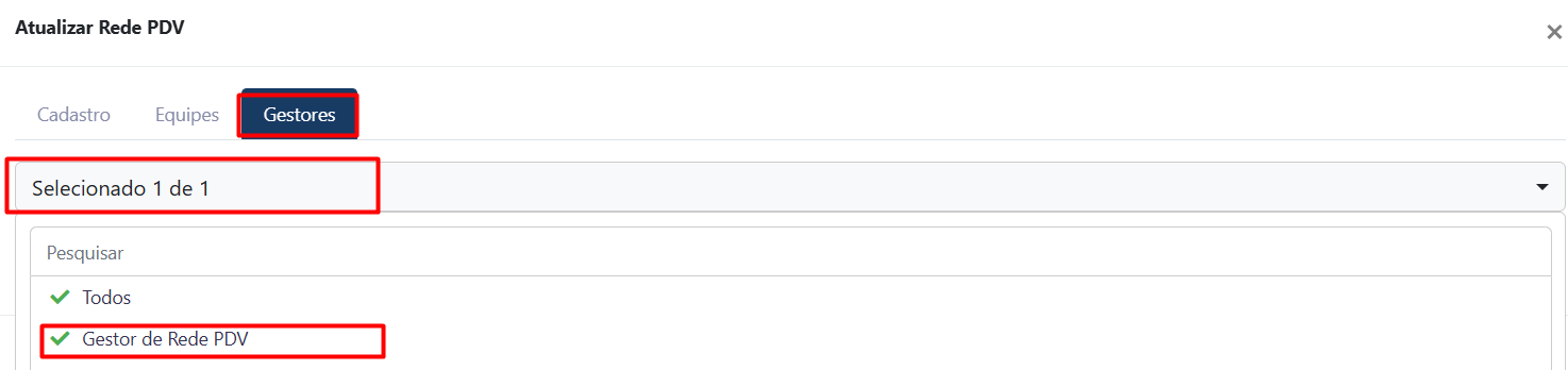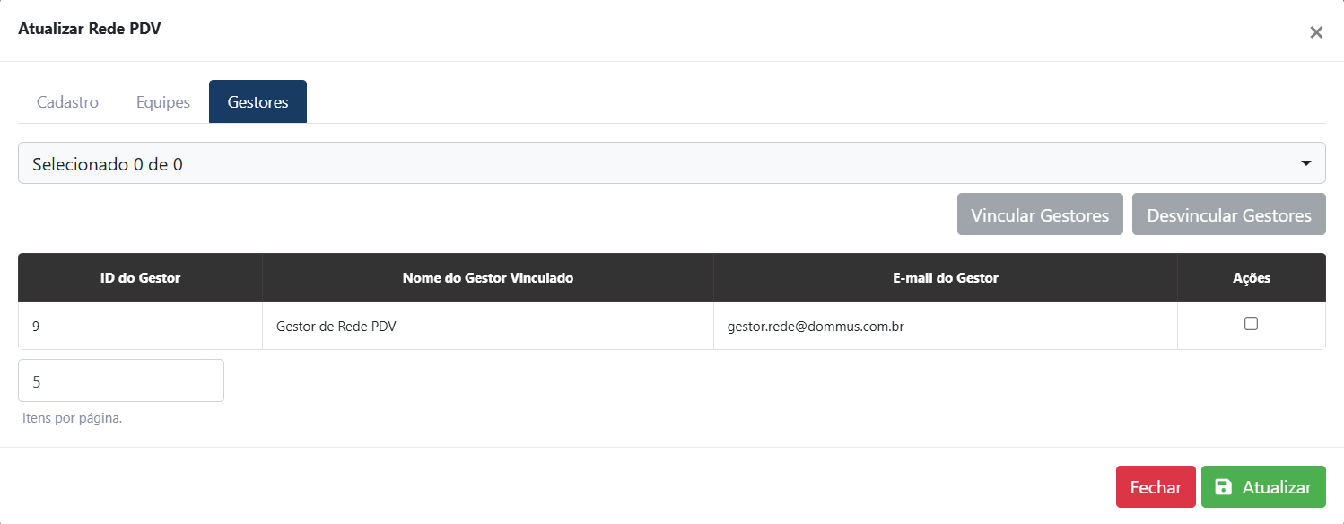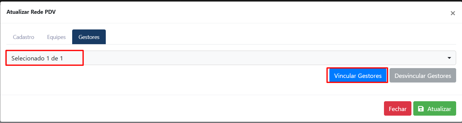 7. Após a seleção dos gestores de rede pdv, clique em 'Vincular Gestores'