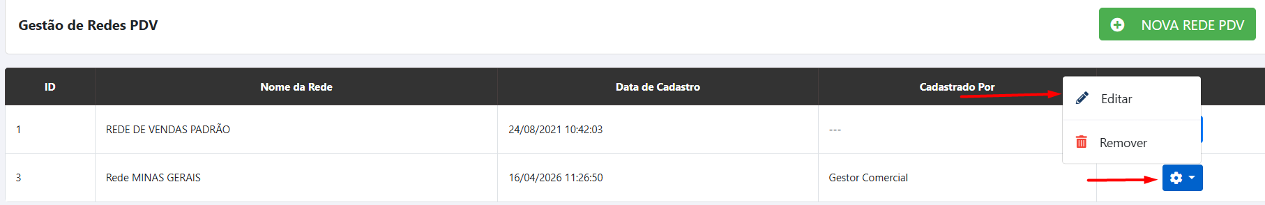 - Permite definir e visualizar quais Gestores de Rede PDV serão responsáveis pela rede